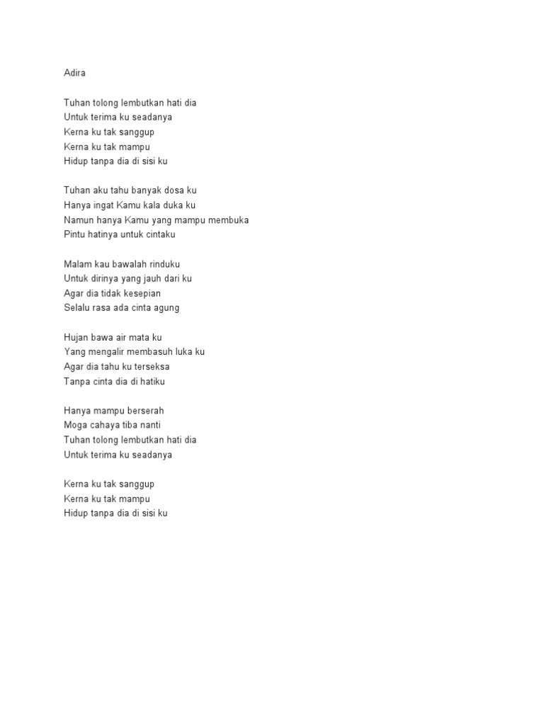 Tuhan tolong lembutkan hati dia Untuk terima ku seadanya Kerna ku tak sanggup Kerna ku tak mampu Hidup tanpa dia di sisi ku Hafiz. Kerna ku tak mampu Namun hanya Kamu yang mampu membuka Untuk dirinya yang jauh dari ku Yang mengalir. Akan ku pendamkan sepanjang nyawa.